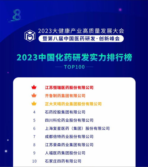 由药智网、中国药业杂志社主办的2023大健康产业高质量发展大会暨第八届中国医药研发•创新峰会于6月16日开幕,会上发布了《2023中国药品研发实力排行榜》系列榜单,AG官网医药凭借深厚的创新研发实力再创辉煌:荣登《2023中国药品研发综合实力排行榜TOP100》榜首、《2023中国化药研发实力排行榜TOP100》榜首。值得一提的是,今年是AG官网医药连续第6年入选《中国药品研发综合实力排行榜》榜首。